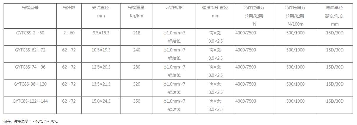 光纤余长控制稳定,成缆后,光纤的附加衰减小于0.02dB/KM,色散值无变化。钢带铠装,抗压扁性能优良,光缆与吊线一次性完工,节约时间与费用,GYTC8S光缆遵循YD/T1155-2011和IEC60794-1标准。