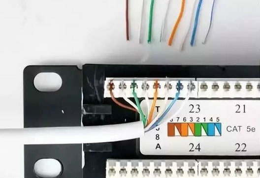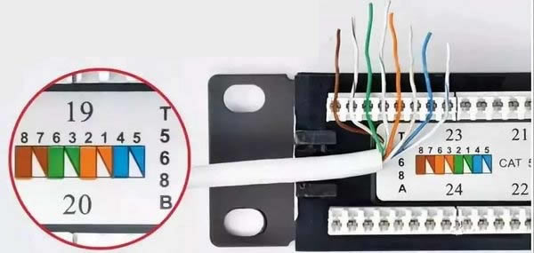 注意:一般配线架后面都有明确的标签,要准确对照国际线序的正确顺序接线。