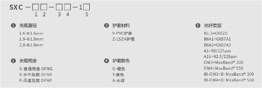 SXC 单芯光缆使用单根Φ900μm 或Φ600μm 紧套光纤作为光传输介质,外覆一层芳纶作为受力加强单元,最外挤制一层聚氯乙烯(PVC)或低烟无卤材料(LSZH,低烟、无卤、阻燃)护套而成。
